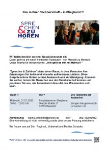 Sprechen & Zuhören” bietet einen Raum, in dem Men­schen ihre Erfahrun­gen frei teilen und einan­der aufmerk­sam zuhören. Diese Gesprächs­form fördert echt­en Aus­tausch und Verständigung.