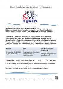 “Sprechen & Zuhören” bietet einen Raum, in dem Menschen ihre Erfahrungen frei teilen und einander aufmerksam zuhören. Diese Gesprächsform fördert echten Austausch und Verständigung.